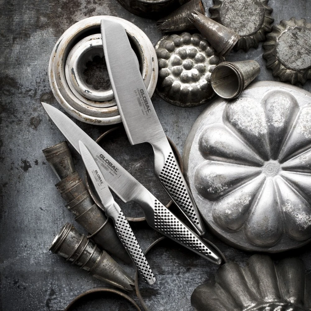 The GS-11 is one of the more popular knives in the Global range and is frequently found in many of the sets where it fills the role of filleting, carving and ‘general purpose’ knife, hence its name. The GS-11 has a medium sized blade at 11cm which is good for filleting small fish such as sea bass. The blade is also flexible which makes it suitable for this purpose. It can also be used as a small carving knife and as it says, utility by name, utility by nature. A fluted version of this knife exists as the GS-36.